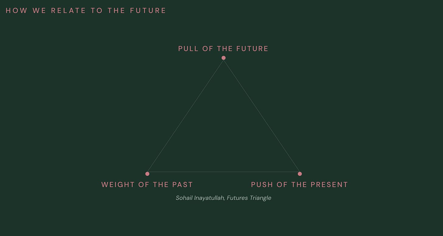 And then there is a third force, one we rarely notice: the pull of the future. Our expectations, hopes, and fears about what is coming. The sociologist Fred Polak described this in the 1950s. We assume the future grows out of the past through the present. Polak said no. Our images of the future pull us toward them.
