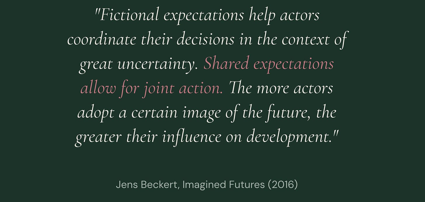 In a future that is open and unpredictable, that is a remarkably uncertain system. How do we deal with it? We tell stories. We try to build shared images. The more people expect the same future, the more they act accordingly, and the more likely that future becomes.