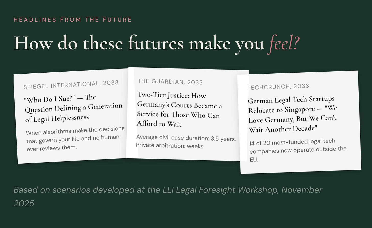 I took the scenarios from the Legal Foresight Workshop in November 2025 and asked, “What happens when we do not stop at abstract scenarios? What might headlines look like in these futures?”