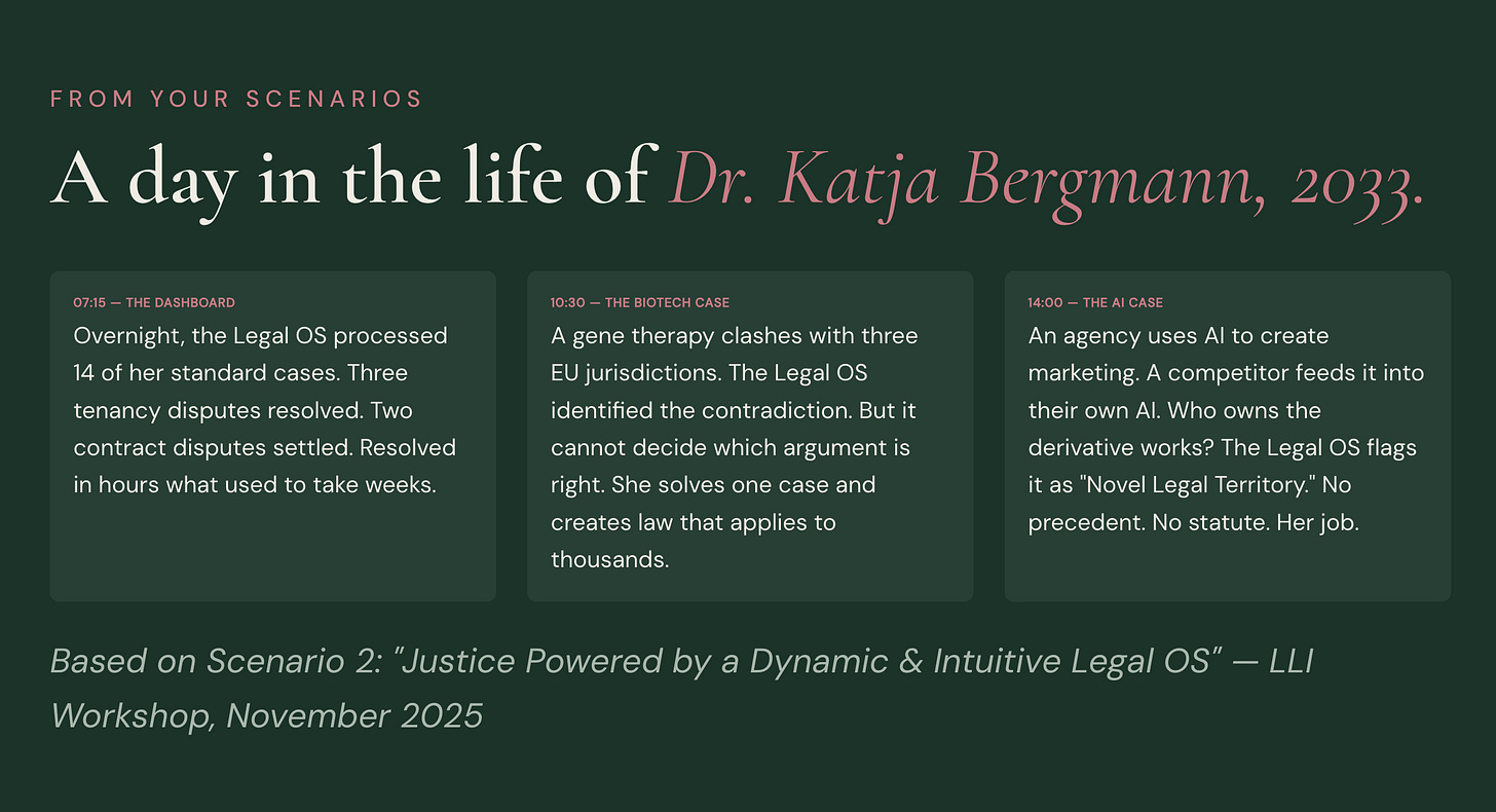 She opens the BundesJustiz-OS dashboard on her tablet. Overnight, the system processed 14 of her standard cases. Three tenancy disputes: facts recorded, law applied, settlement proposals accepted by both parties within hours. She scrolls through the summaries. Clean. Correct. What used to take weeks, resolved before breakfast. But the case on her desk is different: a Frankfurt biotech startup running gene therapy approvals across three EU jurisdictions whose laws contradict each other. The Legal OS flagged the conflict, produced an 83-page analysis, identified 23 partially applicable precedents. What it cannot do: decide which argument is right. For that, it needs Katja.