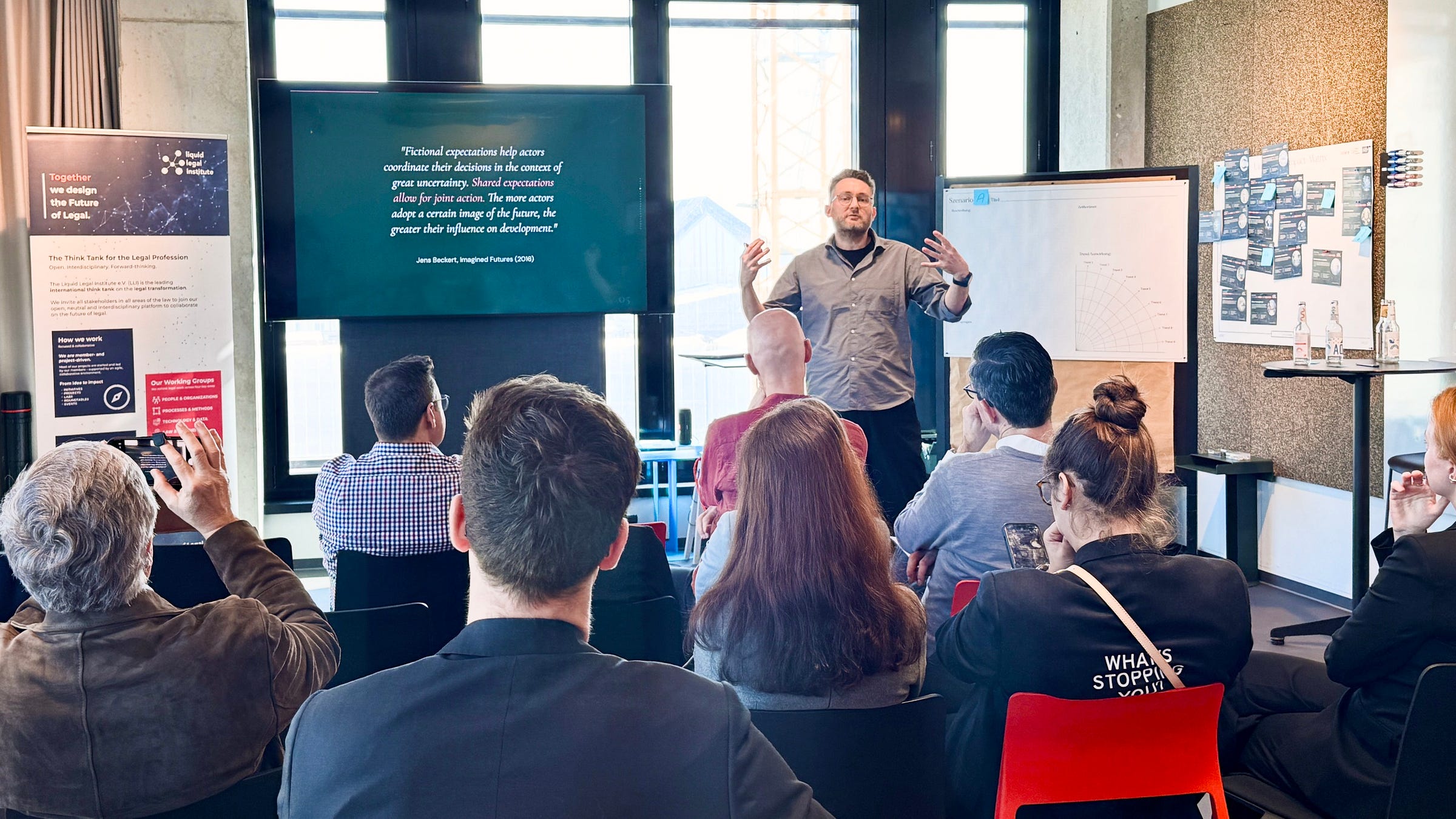 The Liquid Legal Institute brings together over 1,500 legal professionals and organizations working on the transformation of the legal industry. Their Legal Foresight Office runs a workshop series exploring what the future of law looks like. In the first workshop in November 2025, participants developed four scenarios along two axes: weak vs. strong rule of law and incremental vs. disruptive digital transformation. For the second workshop on 5 March 2026 in Munich, I was invited to kickstart the afternoon with a keynote.